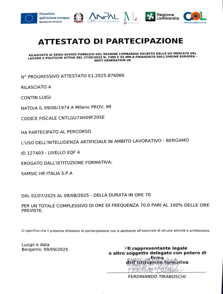 Sono quindi orgoglioso di aver completato un intenso percorso di formazione di 70 ore su “L’uso dell’Intelligenza Artificiale in ambito lavorativo” (Livello EQF 4).