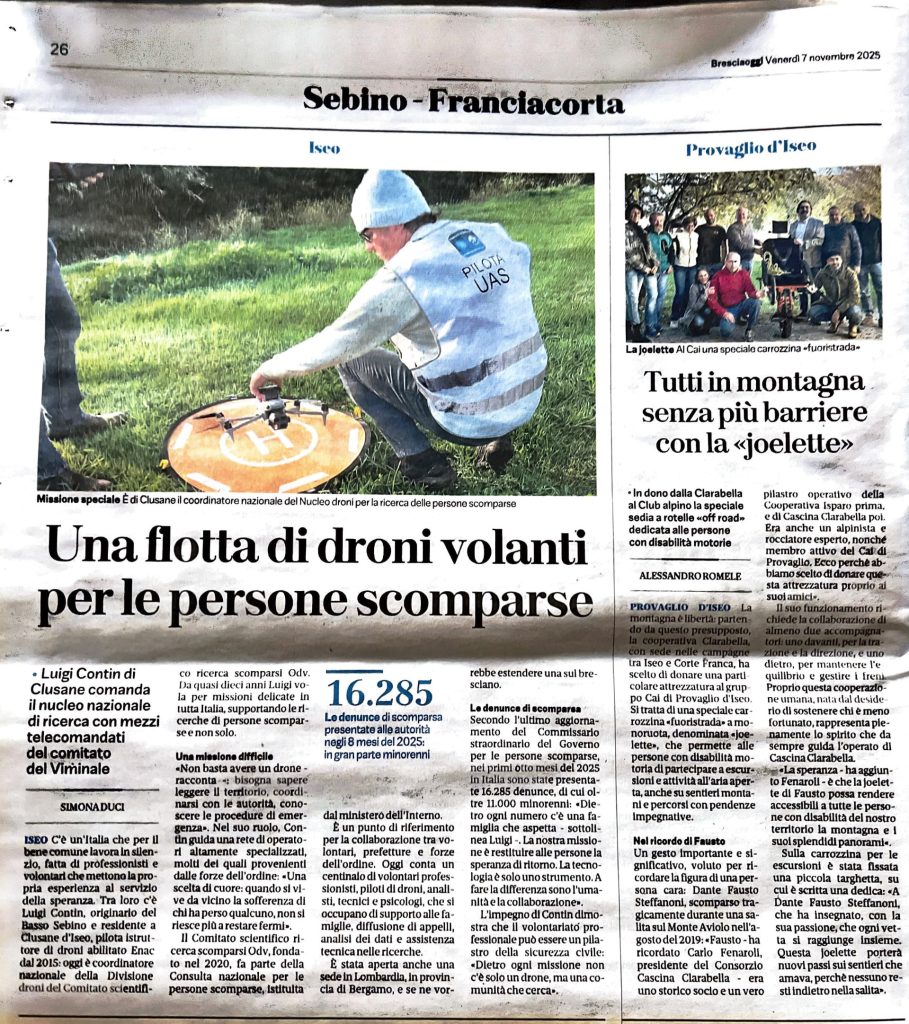 Ringrazio la giornalista Simona Duci e la redazione di Bresciaoggi per aver dato voce al nostro impegno. Dietro ogni missione non c’è solo un drone, ma una comunità che cerca.